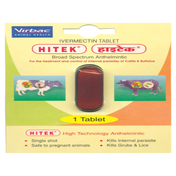 Dose : 200 mcg Ivermectin per kg body weight or Single Tablet of Hitek for 400 kg body weight.